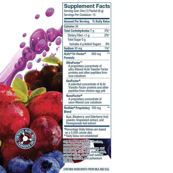 In each of these easily transported packets, there is combined a full serving of 4Life Transfer Factor® Tri-Factor® Formula. It means the package contains 600mg of the Tri-Factor Formula, it boosts your immune system.